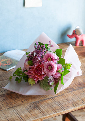 例えば季節の旬のお花と一緒に束ねたり、ガーベラだけを束ねたりなど。お送りするお相手に合わせてデザインをお選びください。
