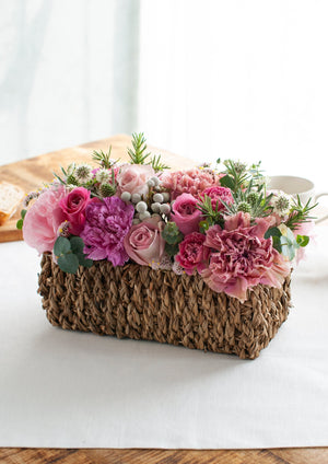 フラワーアレンジメントは「花を整える、飾りつける」といった意味をもち、籠や器に花を飾りつけたもののことを言います。