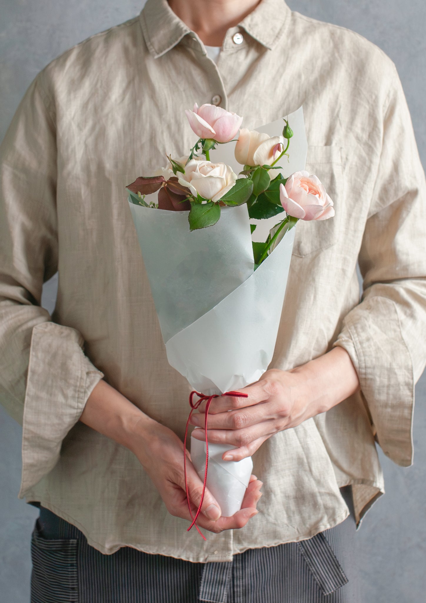 わばらの繊細な美しさを引き立てる、シアーな質感のペーパーで包みました。深みのあるボルドーカラーのベルベットリボンが、秋の空気にやさしく映えます。記憶に残る1日を、上品に彩る花束です。