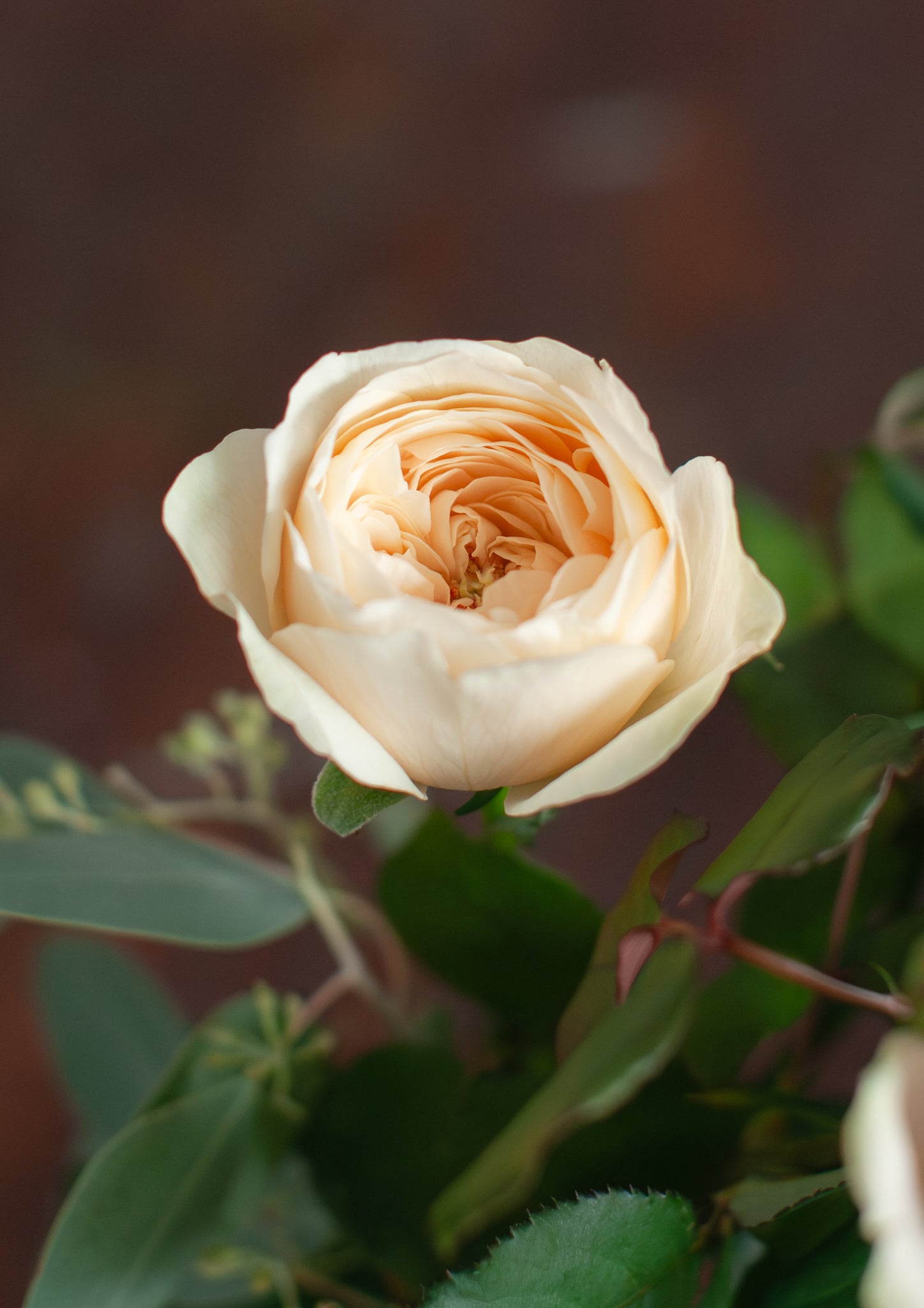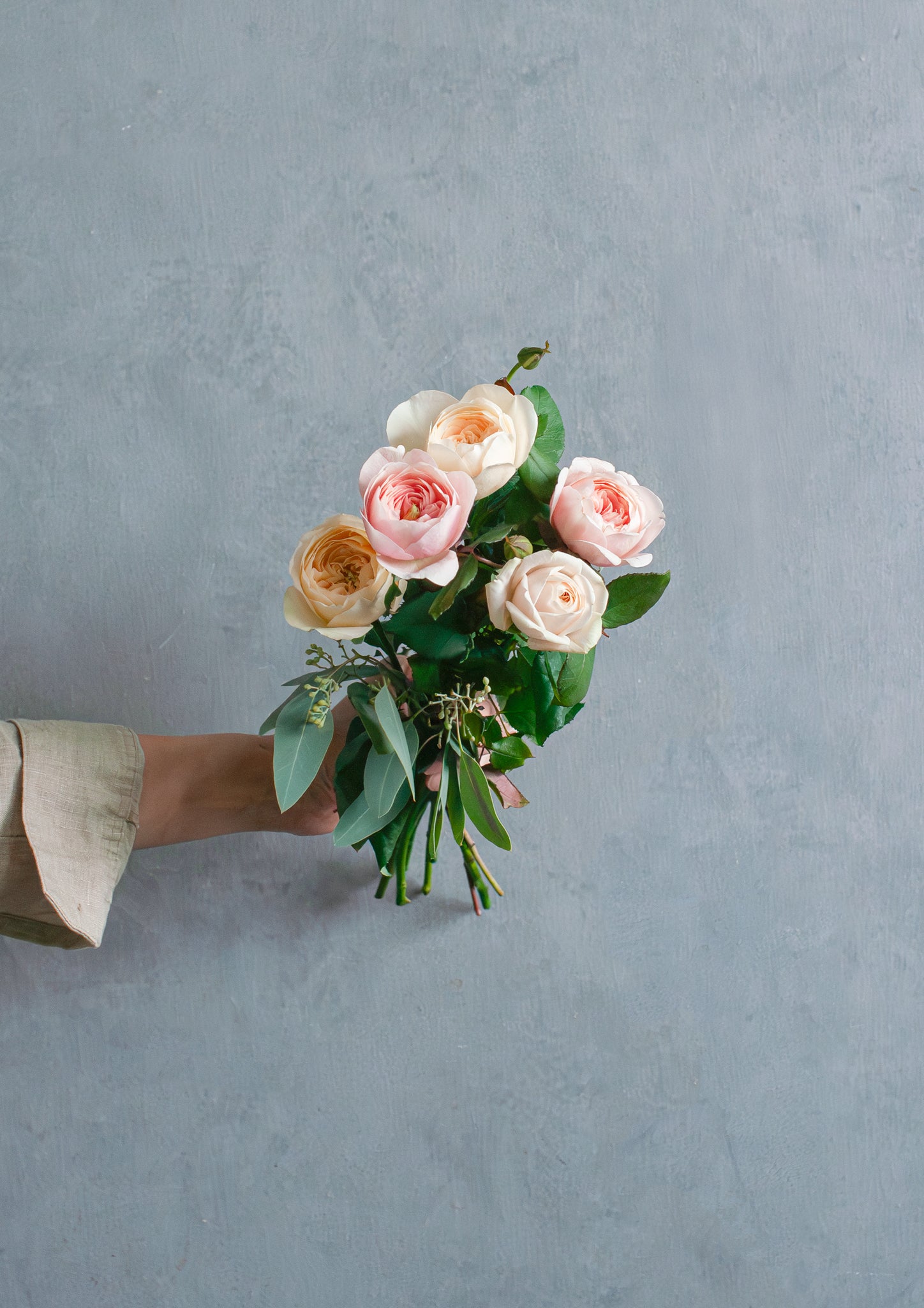 長い時間を共に過ごしてきた2人にふさわしい、やさしさと想い合う気持ちを映したペールトーンのわばらを束ねました。