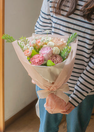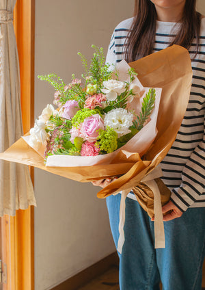 柔らかい色合いでまとめた可愛らしい花束や、色の濃いピンクを使った大人っぽい花束まで、さまざまイメージでご用意します。