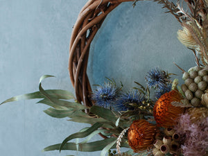 ドライフラワー商品は、スワッグだけでなくリースもご用意。季節を問わずオールシーズン飾って頂けるデザインに仕上げています。スワッグ同様にナチュラルでインテリアにも合わせやすい色合いで。こちらもイメージしやすいように、柔らかい繊細な印象の物と、大き目のお花でお作りした個性的な印象のものでご用意しました。お好みの雰囲気でお選びください。