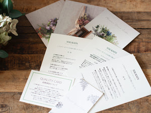フラワーギフトは配送の際に、QUALITY CARD(品質保証カード)とフラワーギフトの管理方法(お手入れ方法)をお付けしております。最善の注意を払い製作、梱包しておりますが、商品ご到着時に「破損」等ございましたら、対応をさせて頂きます。また、フラワーギフトごと(花束、アレンジメント、鉢物など)にお手入れの方法が異なりますので、お手元に届いた後お手入れに困らないよう管理方法をお付けしております。
