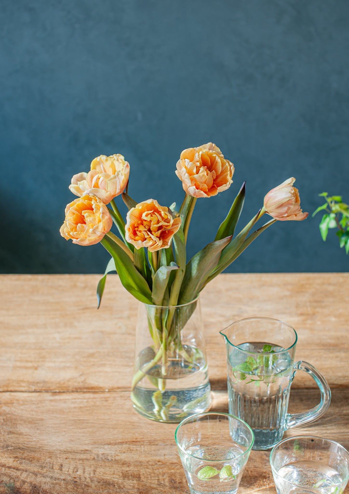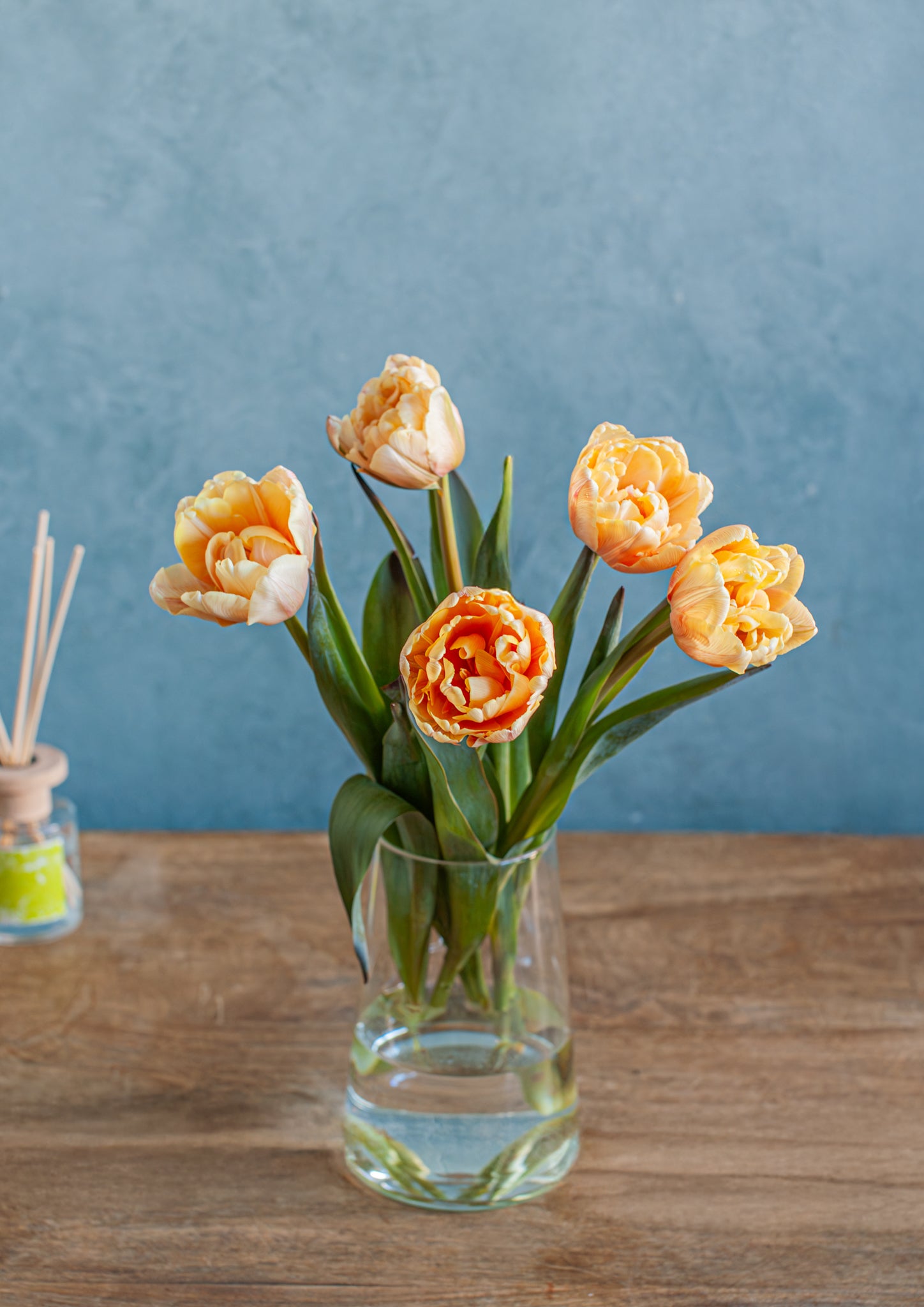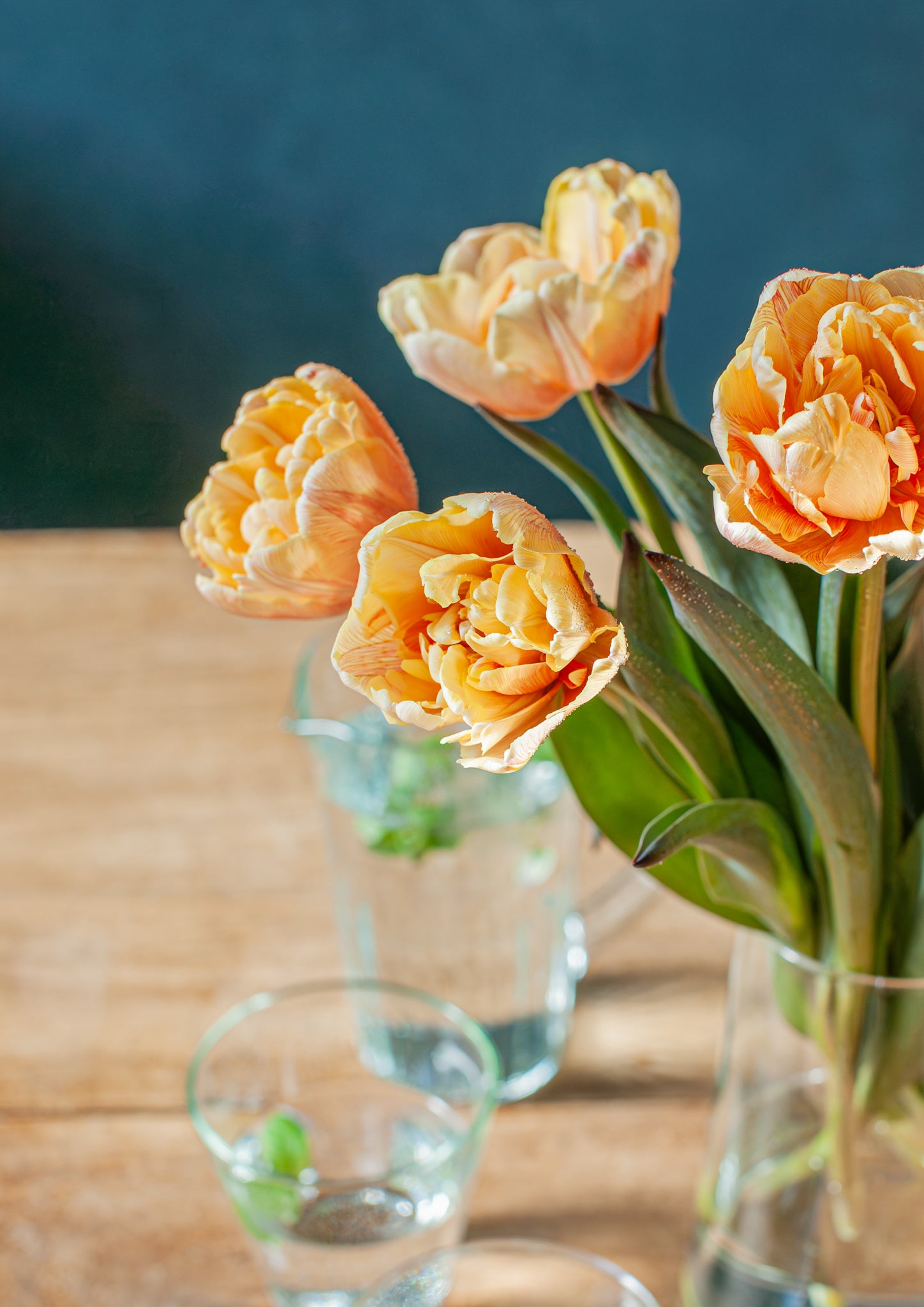 一般的に目にすることの多いチューリップは、一重咲きと呼ばれるスタンダードな咲き方のもの。今回セレクトした染めのチューリップは、花びらが幾重にも重なる「八重咲き」です。