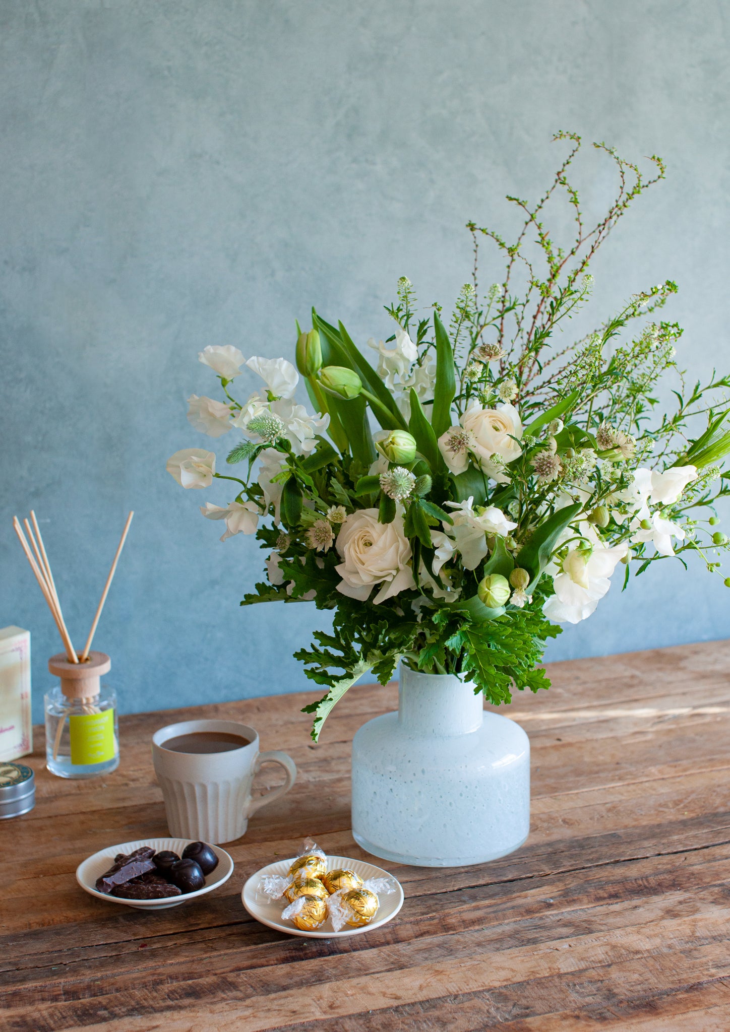 たくさんの種類の春の花やグリーンをすっきりと2色にまとめ、春らしいクリーンなみずみずしさと複雑な奥行きを楽しむことができる花束に仕上げました。