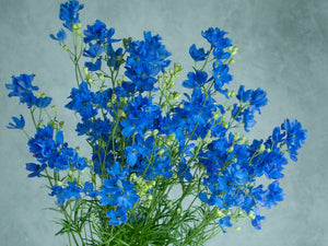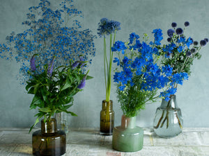 青と言っても色々あります。今回は深い青色や紫がかった青色をイメージでしました。日本の名前で言うと「藍色」や「瑠璃色」。言い方を変えるだけで「青」の雰囲気も変わりますよね。そして、夏空のような「空色」もプラスして、、、お花から涼しさを感じましょう。