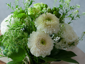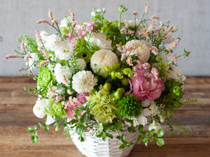 &YOUKAENのお供え花は、他のフラワーギフトと同じくナチュラルな雰囲気が特徴です。お供えではあるけれど、堅苦しくならによう、季節のお花も取り入れ、柔らかいおしゃれな雰囲気に仕上げております。故人の方、又はご遺族の方が穏やかに過ごして頂けるよう、心を込めてお作り致します。