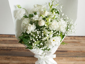 お彼岸のお花に明確な決まりはありませんが、故人の方がお亡くなりになって日が浅い場合は、白色をメインにしたお花をおすすめいたします。また、お亡くなりになってから年数の経っている場合は、季節の旬のお花や、故人やご先祖様の好きだったお花をお供えするのも素敵ですね。