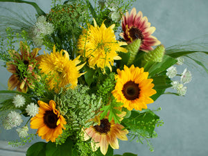 &YOUKAEN 2025年のサマーギフトはひまわりをメインの花材に使用し、涼やかなブルーやグリーンの花材を合わせた、パワーと涼やかさがポイントの「ブーケ」!